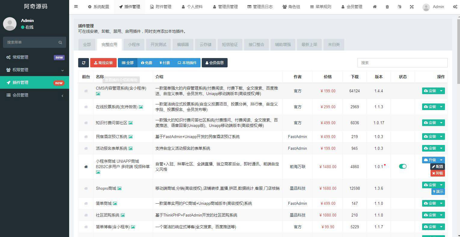 第一次接触这个系统,感觉和微擎有点像。也是一个主体,也很多插件的那种。